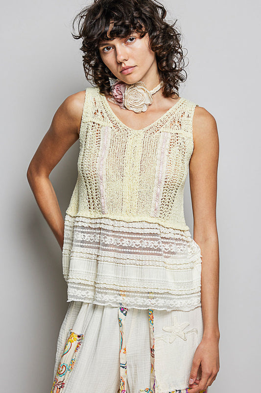 POL V-Neck Crochet Tank with Diamond Weave Knit Patterns