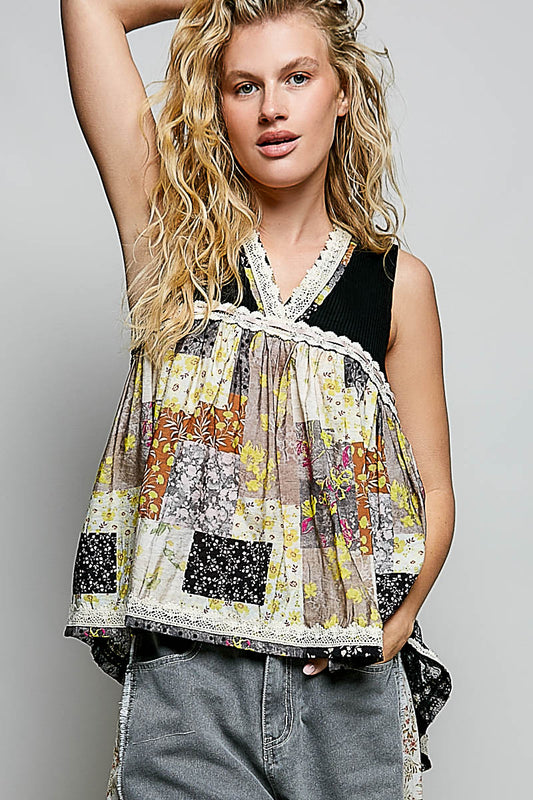 POL Floral V-Neck Sheer Tank with Lace Trim