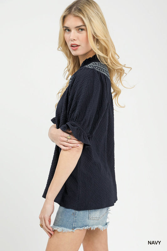 Umgee Textured Henley Blouse with Ruffle Cuffs