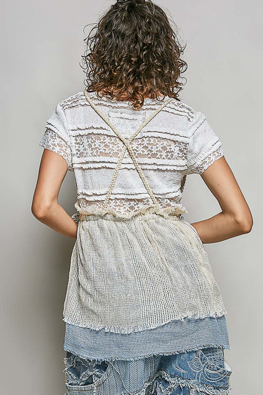 POL Lace Detail V-Neck Short Sleeve Textured T-Shirt