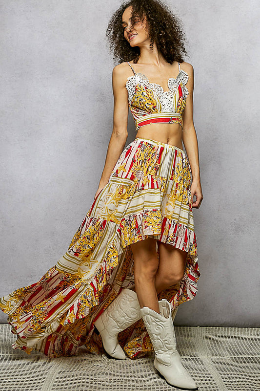 POL Boho Chic Floral Print Crop Top and High-Low Skirt Set