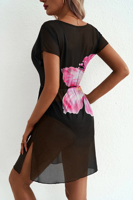e Floral Print V Neck Semi Sheer Beach Cover Up Dress