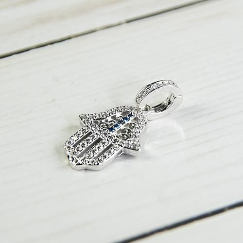 A beautiful Hamsa hand charm on a delicate chain with sparkling zirconia pave on shiny hypoallergenic stainless steel.