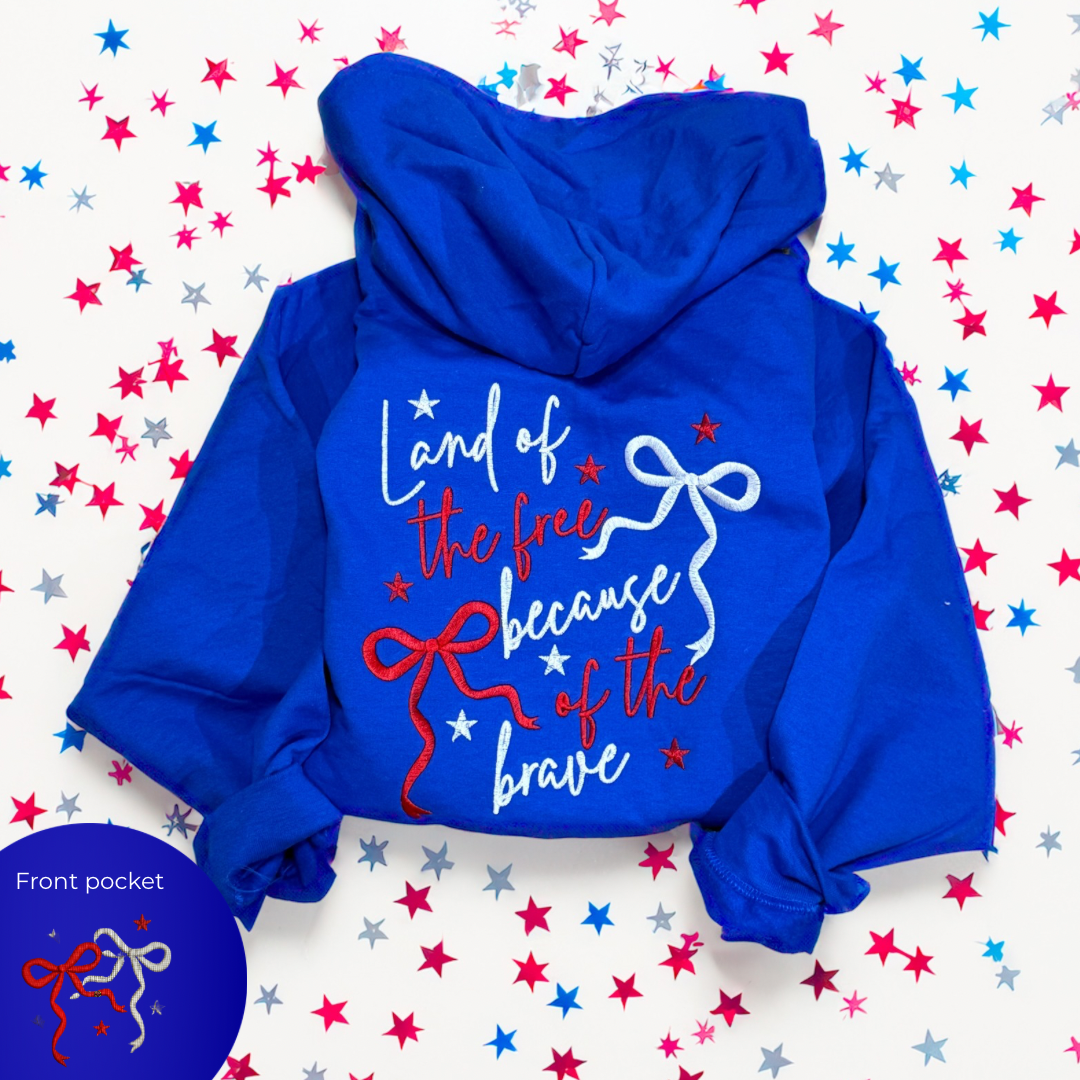 Fully embroidered on gildan hoodies or sweatshirts in royal blue